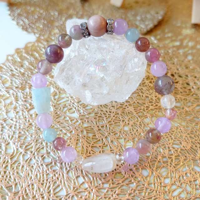 【my little world】 大きなジブンに還る。 陰陽化された地上の原理にしばられた地上のものを 一つずつ、少しずつ、手放していく。 あなたの世界は軽やかに、やわらかに、純化していく。 手首の内径:14cm~15cm 使用石:ラベンダーアメジスト、クンツァイト、シリシャスシスト、トルマリン、水晶、かわいい石達 ※サイズ変更不可 ※お申し込みに際しては”ご購入に際しての注意事項”に同意されたものとみなします ホームページ:https://www.tori-peace.com