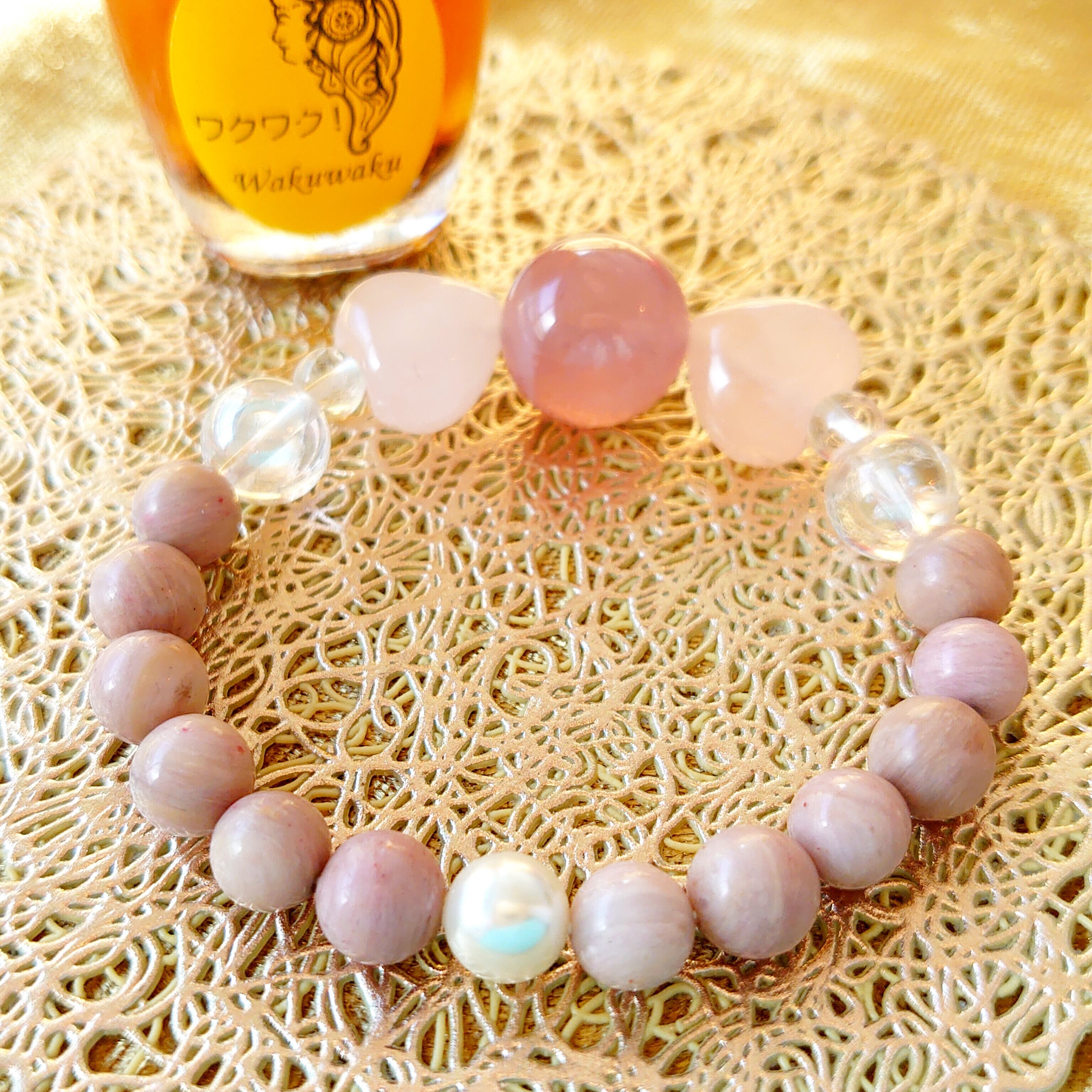 ※手首にはめた際、ハート型のローズクォーツと挟まれた球体で形成するキャンディーリボン型が必ずしもきちんと整うわけではございません、予めご了承ください。