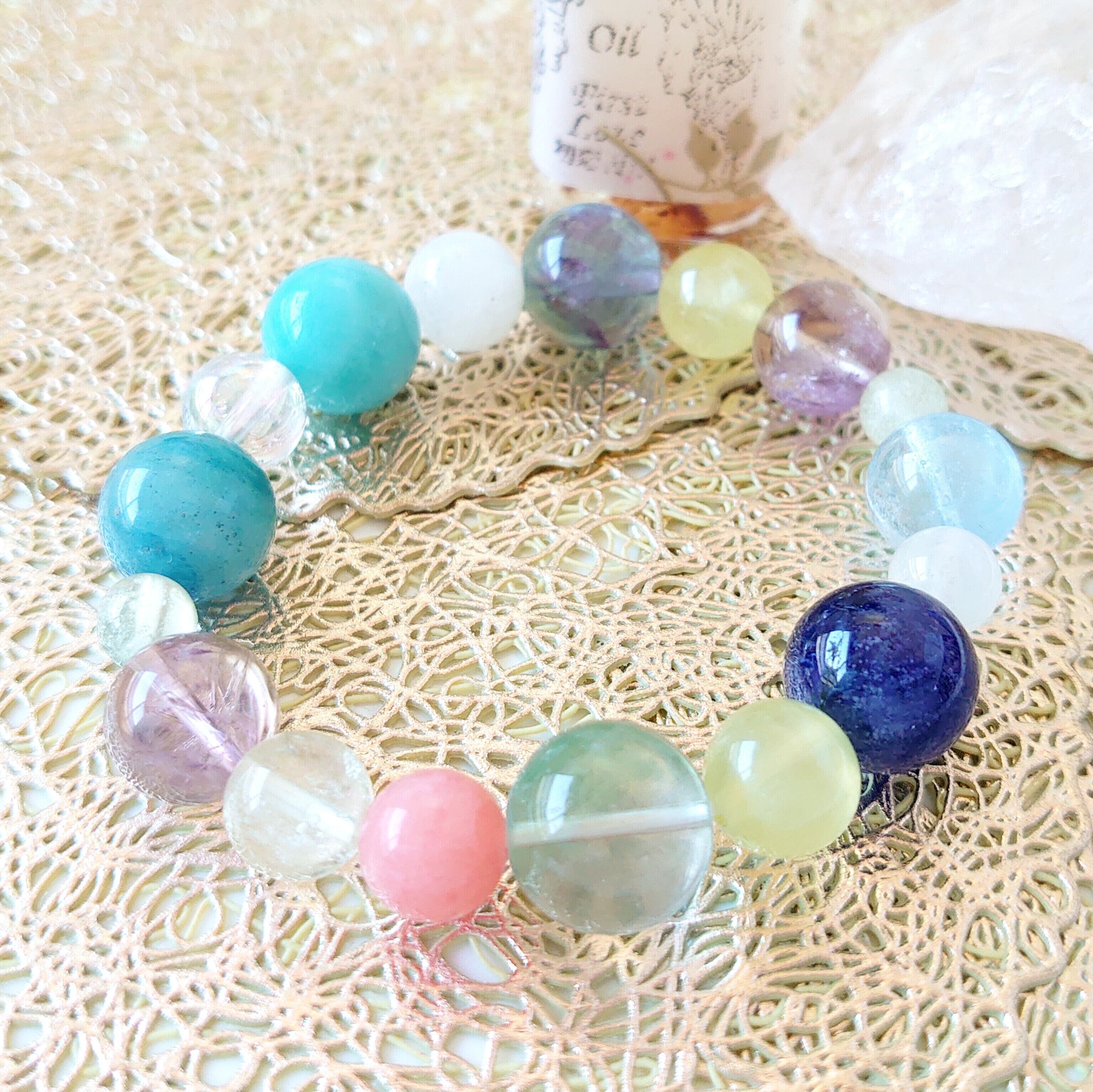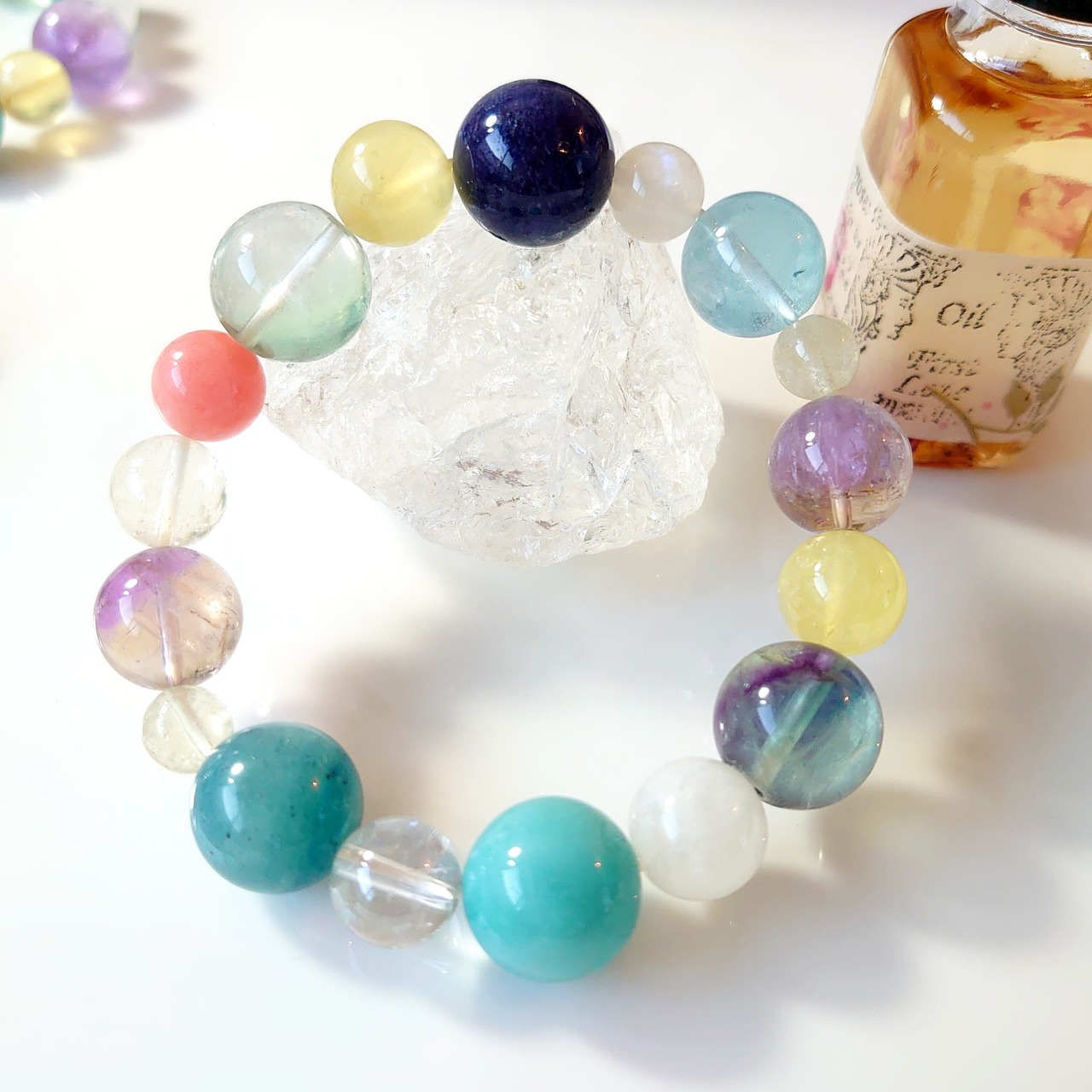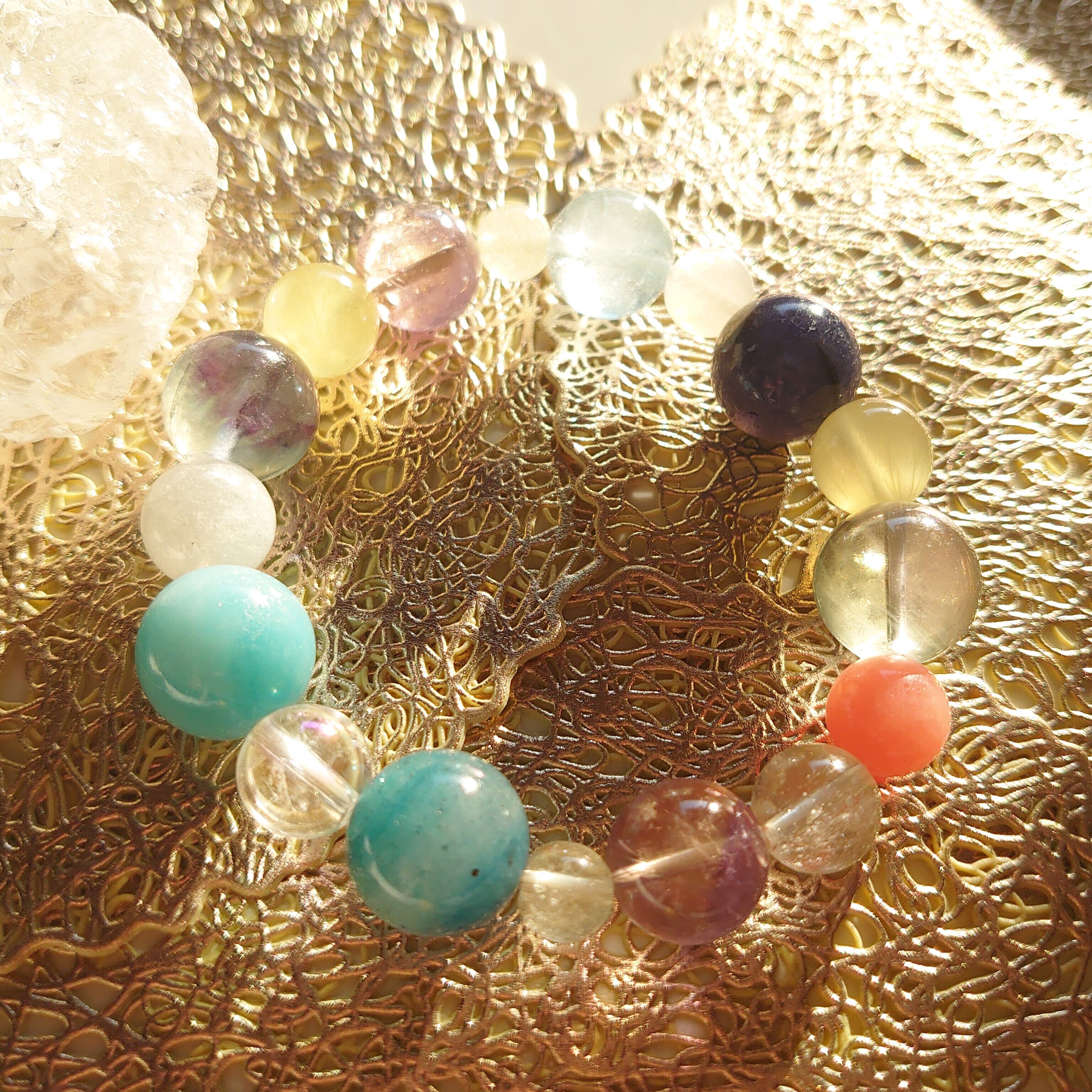 使用石:カイヤナイト、フローライト、イエロープレナイト、レインボームーンストーン、アメトリン、オーラ水晶、アベンチュリン、アクアマリン、リビアングラス他