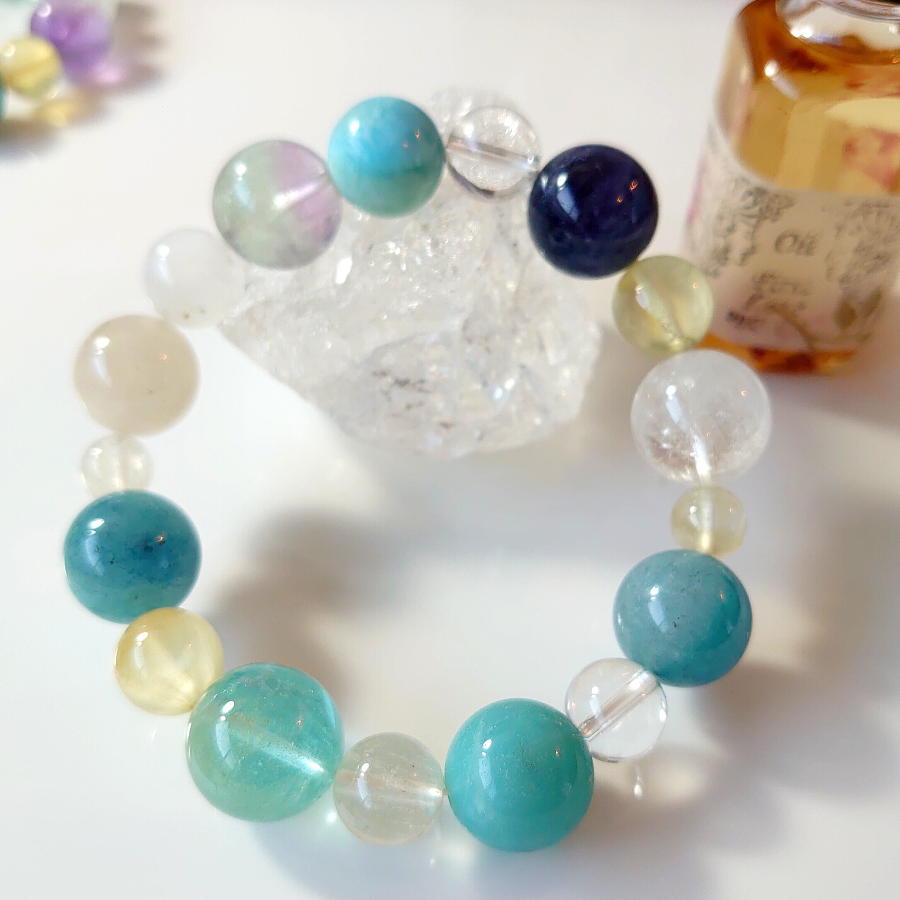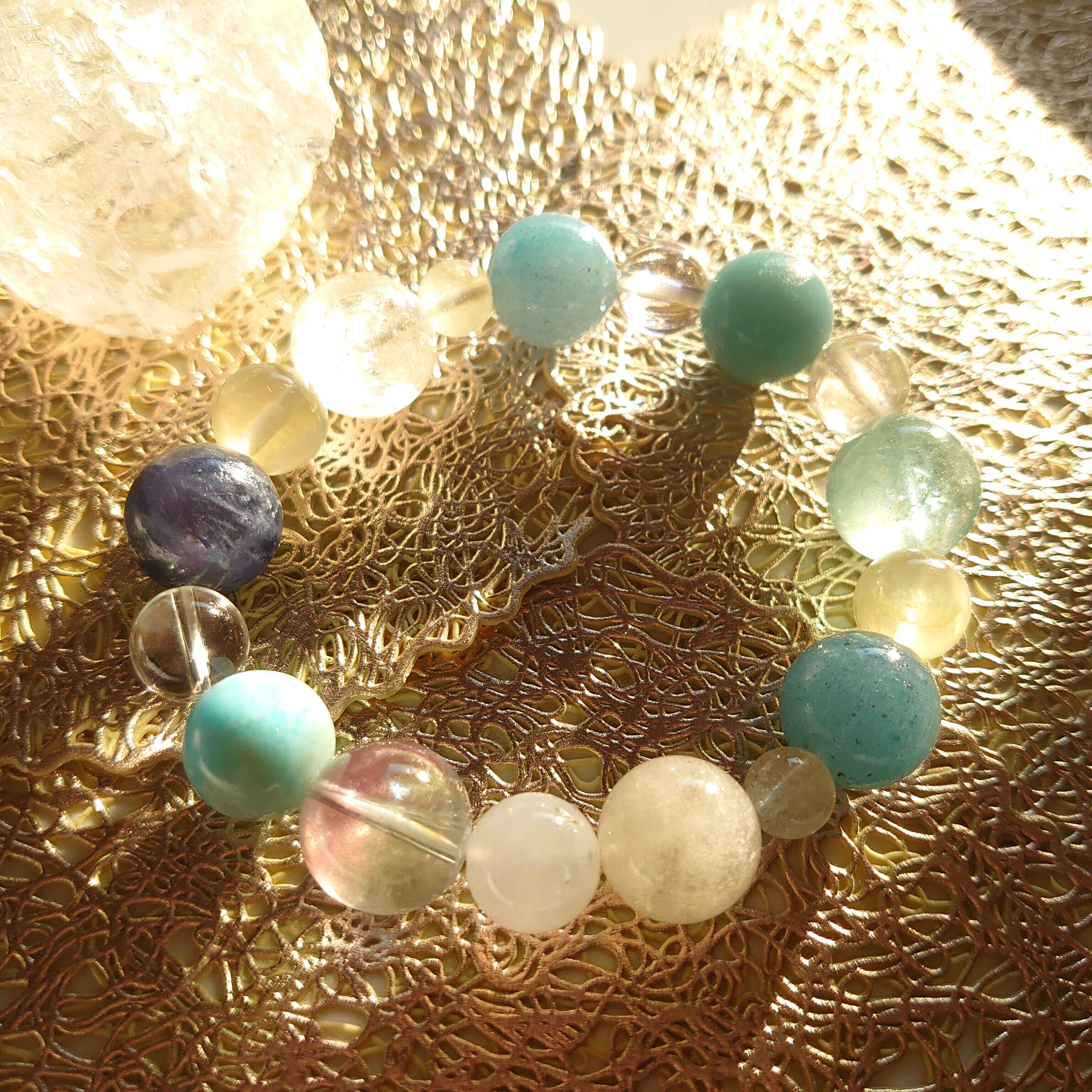 使用石:カイヤナイト、フローライト、イエロープレナイト、レインボームーンストーン、水晶、アベンチュリン、レムリアンシードクリスタル、ブルーグリーントパーズ、ラリマー、リビアングラス他
