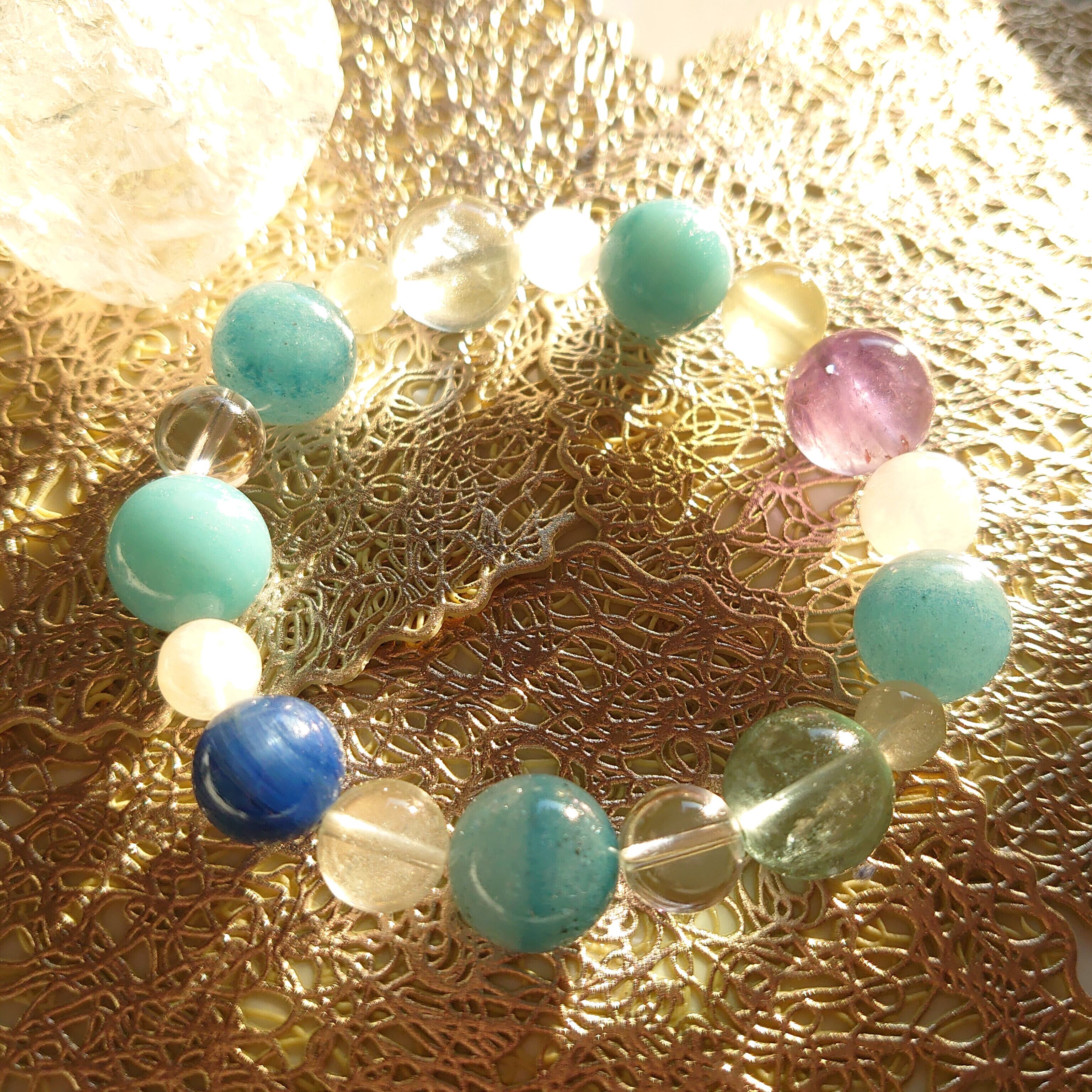 使用石:カイヤナイト、フローライト、イエロープレナイト、レインボームーンストーン、水晶、アベンチュリン、アメトリン、リビアングラス他